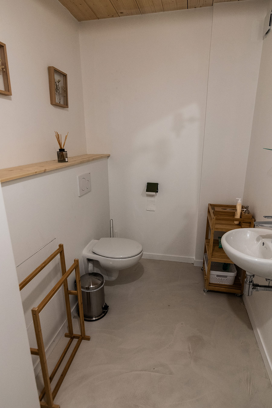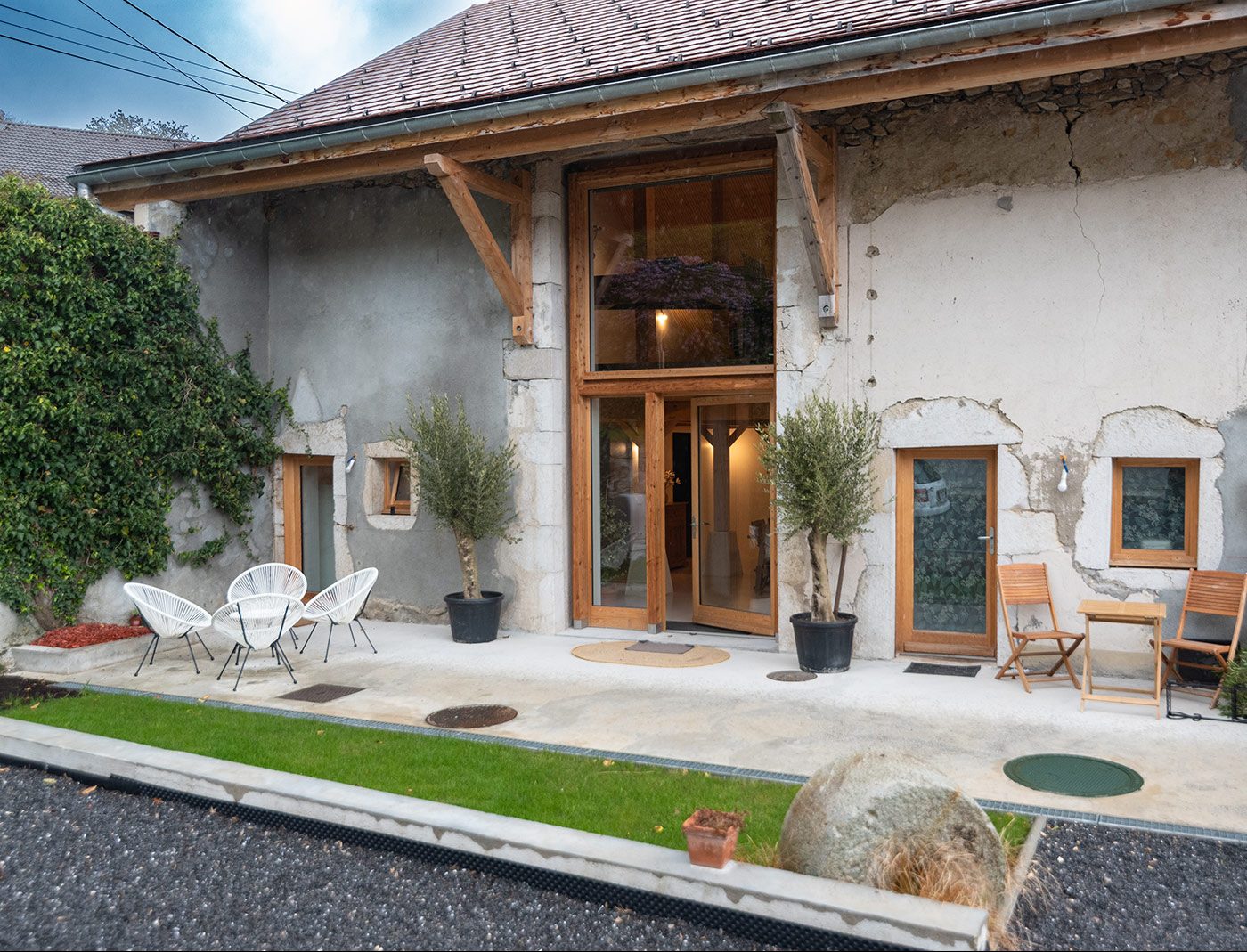Les matériaux bruts et soigneusement choisis: béton ciré, murs en pierre avec joints à la chaux et poutres apparentes, créent une ambiance chaleureuse et authentique.